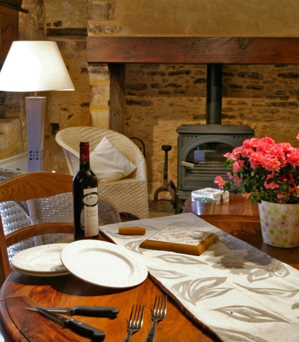 – Séjour avec cheminée (poële à bois), pierres et poutres apparentes. Canapé et fauteuils, table de salon, lampadaire, table, vaisselier, TV connectée.